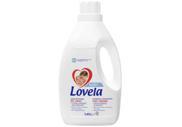 Skystas spalvotų skalbinių skalbiklis „Lovela BABY“ – hipoalerginis ir švelnus. Saugus naujagimių ir mažų vaikų odai. Patikrintas dermatologų.